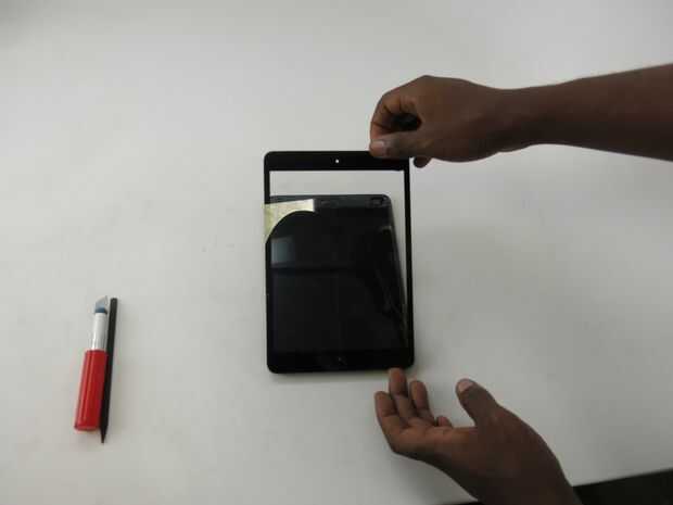 • Levantar el vidrio de la parte superior del iPad y plegar hacia la parte inferior del iPad. El digitalizador todavía está conectado al iPad en este momento por un cable.