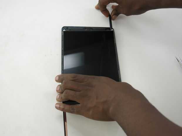 • Utilice su spudger para levantar ligeramente la parte superior derecha de la pantalla LCD, debajo el tornillo agujero es un punto de inserción buena.