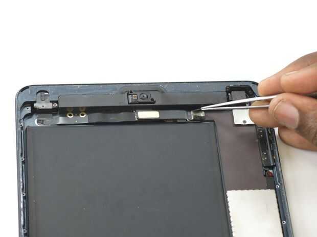 • Mira a la superior f el iPad. Usa sus pinzas para quitar la cinta negra que cubre el conector de la cámara frontal.