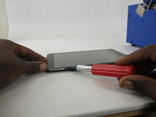 • Inicio de deslice lentamente el spudger plástico en el lado izquierdo del iPad entre el marco del metal y el vidrio de la pantalla. Aplique calor un poco más a la pantalla para aflojar el pegamento cuando sientas demasiada resistencia.