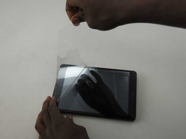 • Con la película plástica cubriendo todavía el doble cara adhesiva, cierre el iPad y darle una minuciosa inspección. Compruebe que no hay huellas, manchas o polvo atrapados dentro. Utilice un paño limpio y limpiador de la pantalla o alcohol isopropílico para limpiar cualquier impresiones. Aire comprimido o aire funciona muy bien para quitar el polvo.