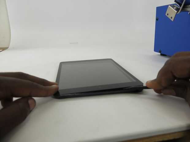 • Continúe moviendo el spudger en el lado izquierdo del iPad entre la estructura de metal y vidrio de la pantalla.