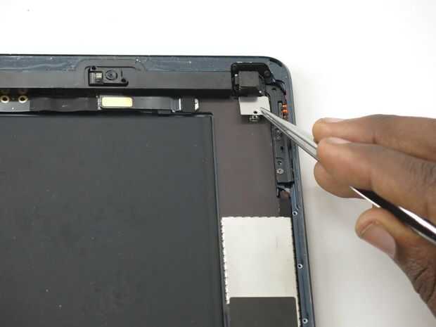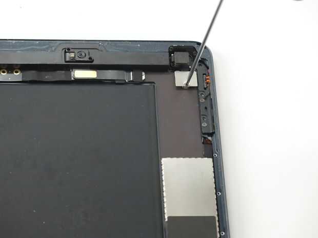 • El trasera frente a la cámara está conectada a la placa base por un solo cable. Este cable está cubierto por un escudo pequeño. Use el destornillador para quitar el solo sosteniendo el escudo en su lugar.