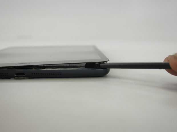 • Use el lado plano de su plástico spudger para empujar el cable digitalizador en la esquina inferior derecha. Su objetivo es asegurarse de que el cable dobla hacia adentro hacia la pantalla LCD que cerca el iPad. Si este cable no se dobla hacia adentro y se ve atrapado entre el bisel y el digitalizador, el digitalizador no sellará correctamente.