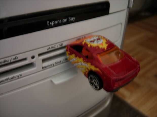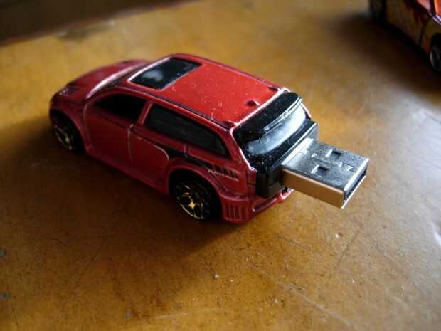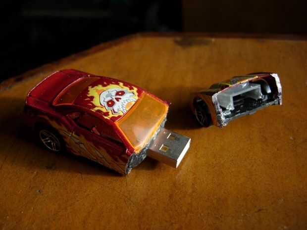 El coche de cráneo fue cortado por la mitad con la Sierra de joyero, y un tapón de la USB fue pegado en la mitad delantera. Es sorprendentemente segura y rueda bien.