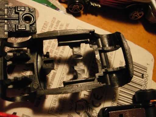 Alineando el chasis con el interior, marca las piezas que necesitan ser removidas. Esto es más complicado, porque el caso se va a través de los asientos y esas cosas. Vaya lentamente, compruebe a menudo y siempre corta de tu carne.