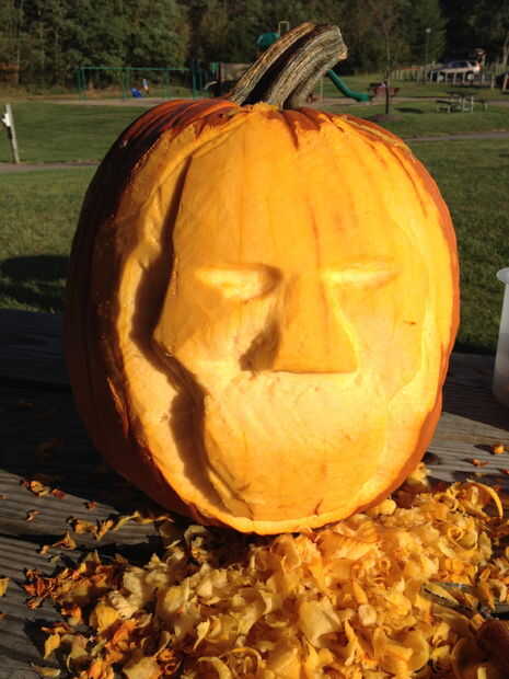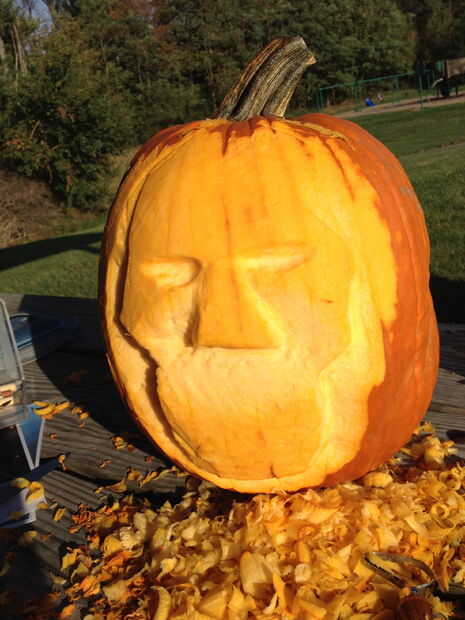 En este paso se puede ver que he empezado a perfilar donde será la cara y el exterior de esa forma. Usé una herramienta de cinta y un cuchillo para extirpar las áreas y definir esa zona. Entonces me adelanté y quitado más área bajo y a los lados de la nariz en el labio superior y boca será. Estos dos proceso comienzan a aportar estructura a la cara