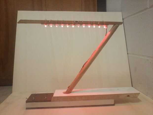 Se trata de una lámpara que he hecho con restos de madera encontrados en la basura, entre otras cosas. Estos incluyen las barras de un marco de madera, listones de madera y un board de masonite. La fuente de luz proviene de una señal de salida trashed, desmontables para obtener las luces y cableado (los pasos para esto aparecerá más tarde). La principal fuente de energía es una batería de 9 voltios (que costó un dólar). Pernos de argolla pequeños (que aunque costó dinero, no contó hacia los costos de la construcción de la lámpara) fueron adquiridos y utilizados para atar los cables eléctricos a las barras y alambre se usa para fijar las luces led en lugar. Pegamentos para armar la lámpara incluyen cinta y pegamento de madera.
