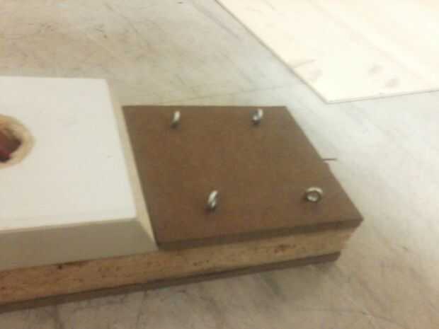 En cada uno de estos agujeros, inserte un perno de argolla pequeña y manualmente en el tornillo. Una vez que se atornillan las cuatro armellas y se asegura la cobertura de masonite, retire los pernos de anilla y la cubierta y guardarlos para más adelante.