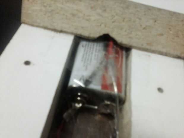 Coloque la batería de 9 voltios en el cut-out en su lado ancho (elevación para arriba de los dos cables al hacerlo).