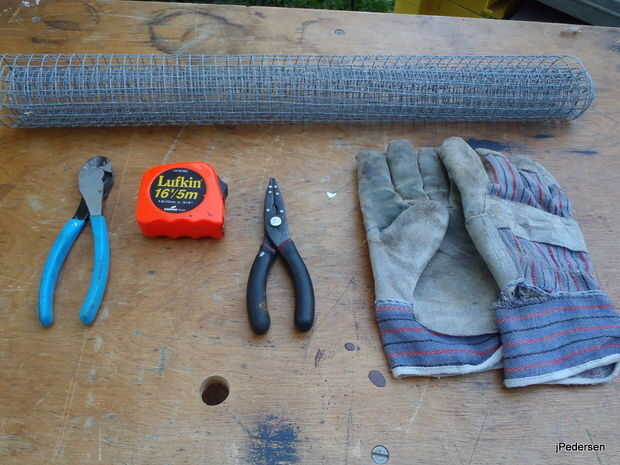cinta métrica, cortaalambres, alicates de punta, guantes de cuero, marcador negro, taladro y broca de pala grande (1/2"), clave serrucho, un destornillador para ajustar los tornillos utilizados.