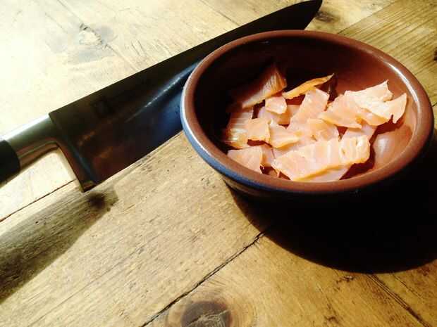 Cortar el salmón ahumado en tiras finas que se cocinan fácilmente