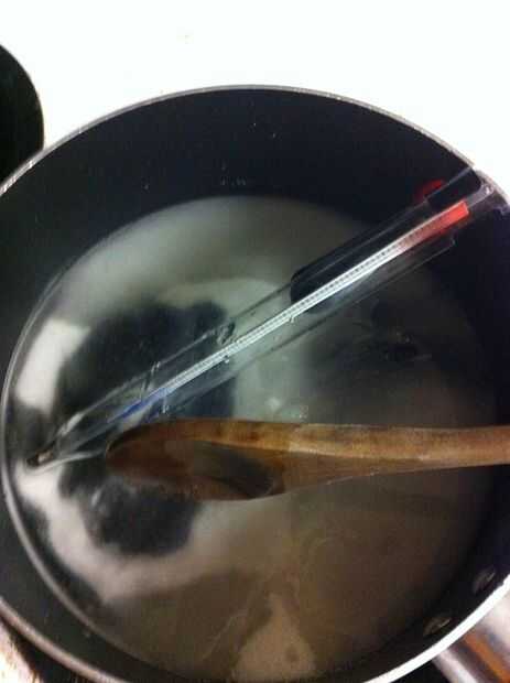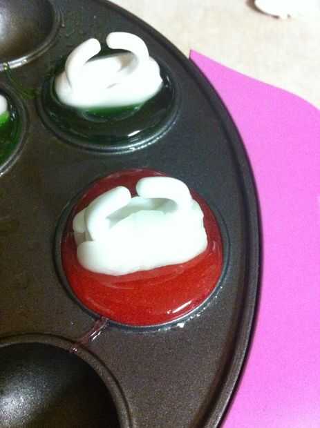 Mezclar el azúcar, el jarabe de maíz y agua en la bandeja. Calentar hasta 300 grados encima de la estufa en una sartén. Entonces rápidamente vierte la mitad en un recipiente de vidrio. Mezclar koolaid de cal en la mezcla en el recipiente de vidrio y la cereza en la mezcla que está todavía en la sartén la mezcla. (Esto no está en la foto porque tienes que trabajar rápido). Entonces cuidadosamente Vierta la mezcla de lechón en pop pastel engrasado. Añadir pop anillo base en el círculo. Deje que se enfríe.