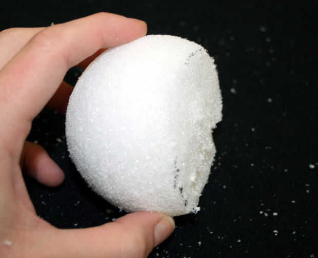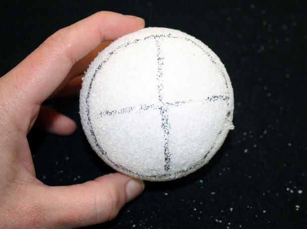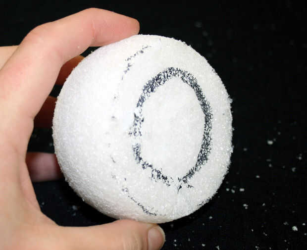 • Marque ambas bolas styro con líneas de corte. Creación de líneas de la marca de la Cruz me ayudó a dibujar un círculo bastante incluso y siempre las marcas para que me ayude a cortar fácilmente la espuma de poliestireno.