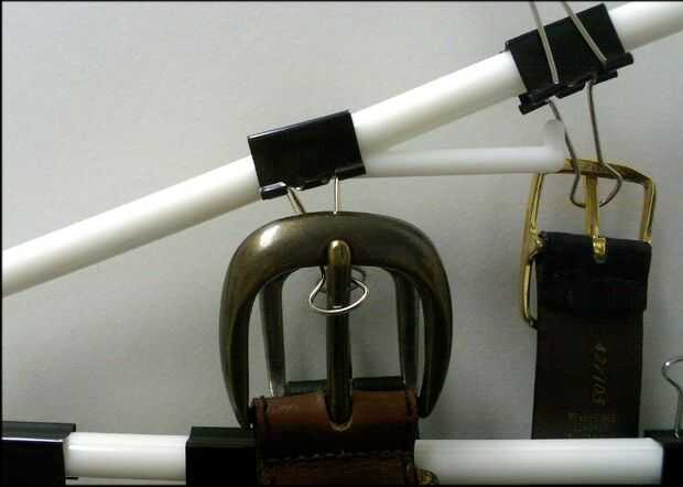 Tomar una suspensión plástica de 1/2" de diámetro y pinza de 12 x 1" presillas de papel binder a él. HECHO! La construcción es completa en menos de un minuto, ocupa 20 cinturones y me costó nada porque tenía una suspensión y los clips sentados. No hay necesidad de estante en $20 dólares correa e instalarlo. Es totalmente portable, colgar en cualquier lugar y moverla en cualquier momento y muy fácil de usar.