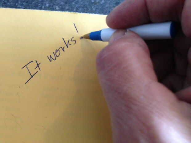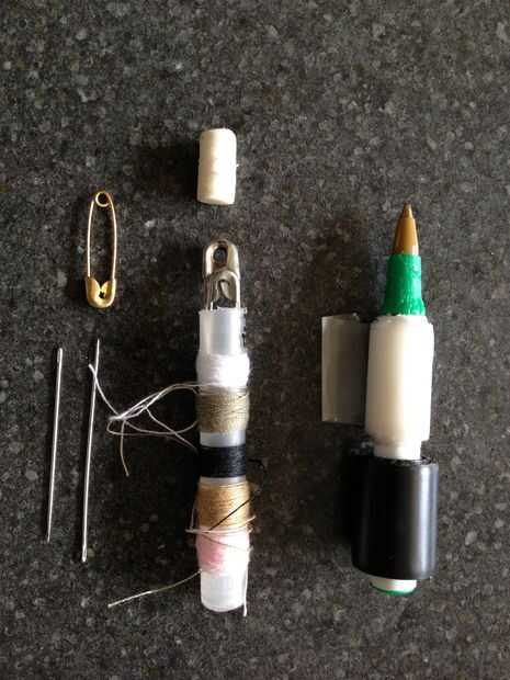Revisa mi Rx botella de emergencia Kit instructivo ver cómo empacar juntos junto con artículos útiles como cinta adhesiva, gomas, hojas exacto, ataduras de cremallera, una lima de uñas (archivos otras cosas también), curitas y siempre útiles clips de papel.