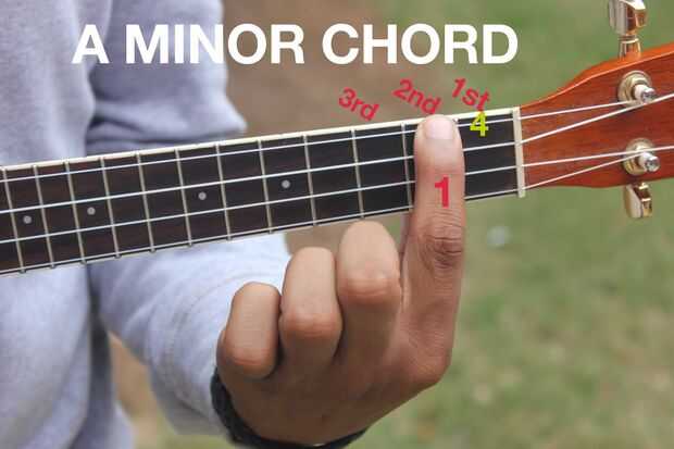 Tan sencillo como el el acorde importante de C, el acorde de A menor de edad es sólo un dedo , pero tenga cuidado de no tocar ninguna de las otras cadenas o usted puede conseguir un tiempo distorsionado este es el tercer acorde en la progresión de cuatro acordes. Una vez más la práctica transición a través de los acordes para ser más fluido con los cambios de acorde.