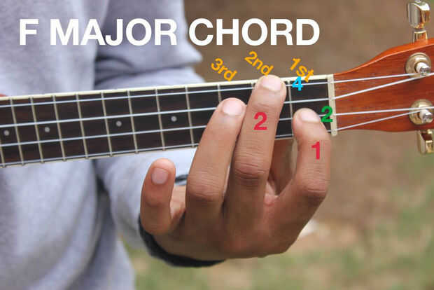 El último acorde de la progresión es un acorde de F mayor. En pocas palabras es un acorde menor A con un dedo extra. Trabajo sobre los acordes anteriores y luego este para formar parte de la memoria muscular de los acordes.