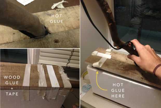Utilice una pistola de pegamento caliente para pegar el punto de intersección de la rama a su agujero correspondiente en el tablón de madera. A las dos tablas en la parte superior con pegamento para madera - en lugar de utilizar pegamento de madera, atar firmemente las piezas con cinta.