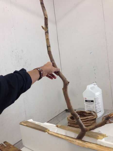 Decidir cómo colocar la rama en la caja de la espuma de poliestireno - elija una posición que garantiza el equilibrio y la integridad estructural. Una vez que se ha elegido una posición, marque el punto de la rama que intersecta con la parte superior de la caja de la espuma de poliestireno.