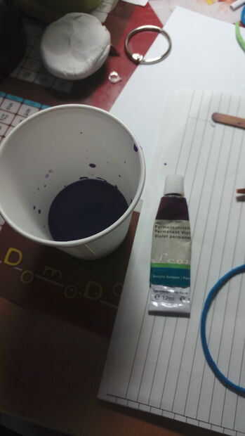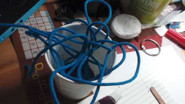 Tengo algunos consejos para morir de la cuerda. No es fácil conseguir el tono perfecto de azul en la tienda. Ellos muriendo poco a poco, sería gran remedio. Solo tubo un poco de acrílico en agua, diluir bien. Uso colores finos, causa usted puede teñir otra vez de tono más oscuro. Es manera más difícil al tinte de las Naciones Unidas. a empapar la cuerda por completo, dejarla secar, teñir otra vez si es necesario.
