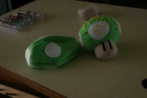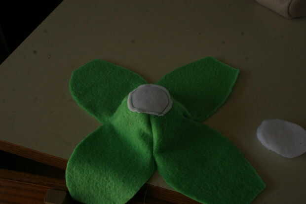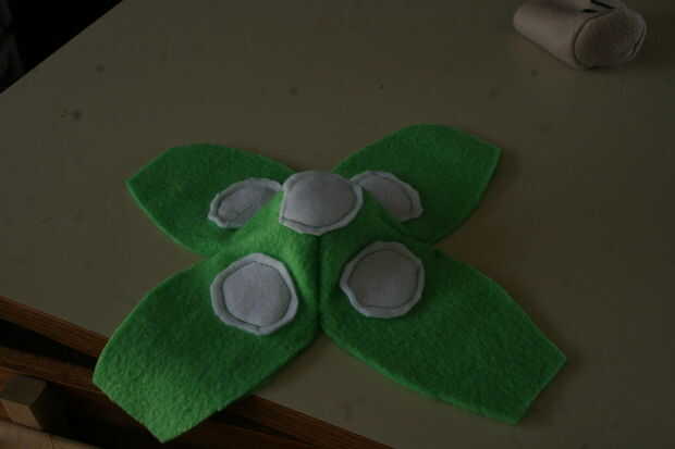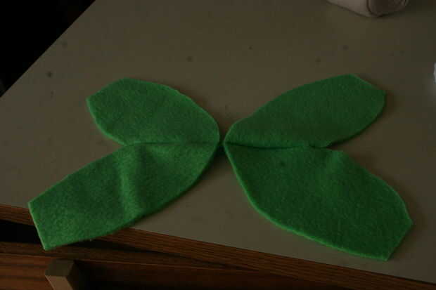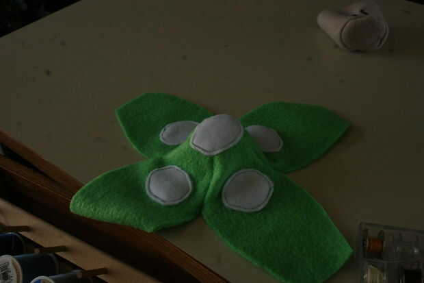 Coser el primer lugar. Utilicé una tapa de la puntada,-porque me daba pereza y dos - porque no esperaba que se vea mal. El fieltro termina por cubrir las líneas de puntada de todos modos por lo que no era muy notable, el canto áspero de los lugares sólo hace que se vea un poco más borrosos. Utilicé hilo verde, pero puede muy fácilmente cambiar a blanco para ocultar las costuras aún más.