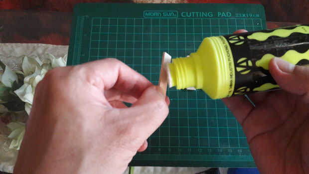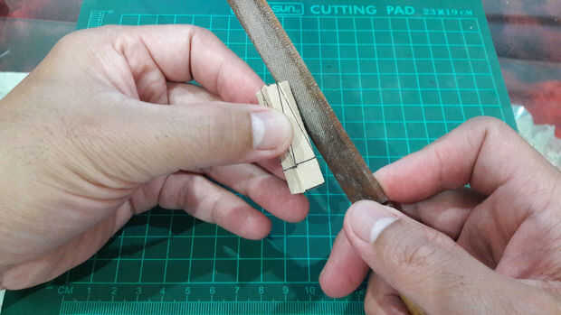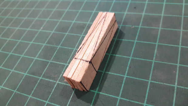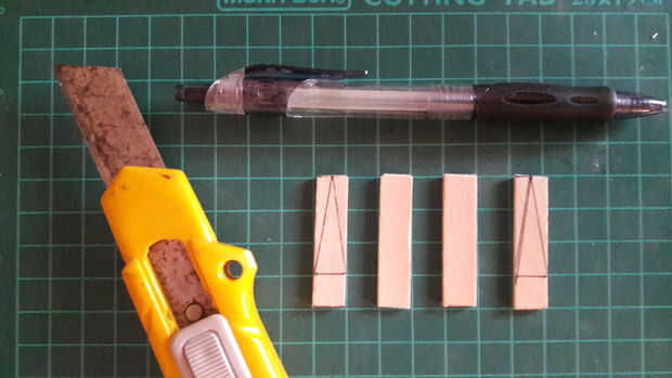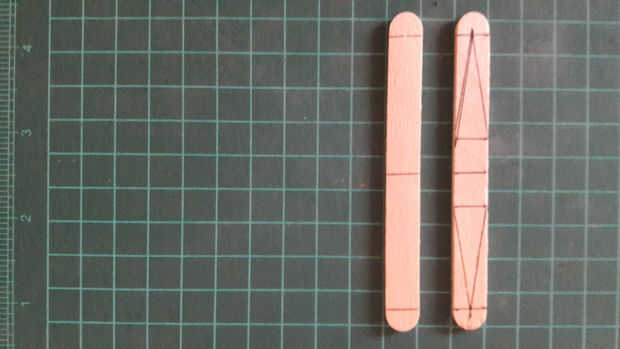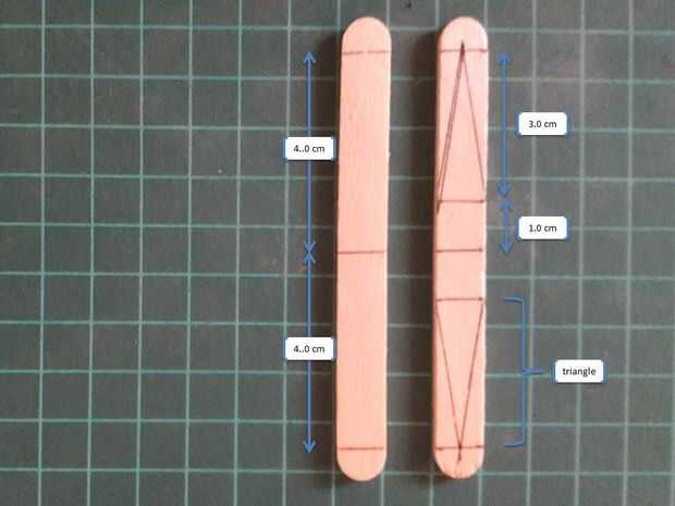 Tomar 2 palito de helado y dibujar unas líneas (diagrama de la imagen). Luego, cortar los palitos y tengo 4 partes. A continuación, pegarlos juntos y archivo la superficie según las líneas.
