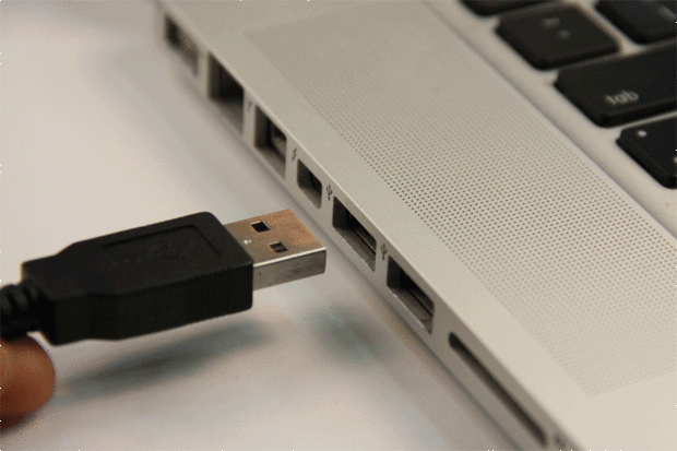 a continuación, tomar el extremo opuesto del USB A USB-B, tres pies de cable y enchufe la clavija de USB-A en cualquiera de las ranuras de USB-A en su computadora.