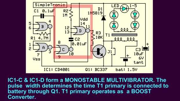 Este LED flasher parpadeará continuamente durante 10 años en un solo 1, 5V pila alcalina AA. Esto es posible por alcanzar un consumo de corriente promedio de 35uA (microamperes).Paso 1: Este es el diagrama del circuito completo de la luz intermitente
