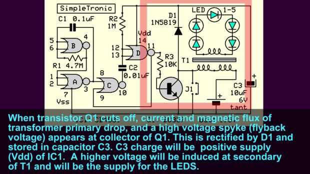 Este LED flasher parpadeará continuamente durante 10 años en un solo 1, 5V pila alcalina AA. Esto es posible por alcanzar un consumo de corriente promedio de 35uA (microamperes).Paso 1: Este es el diagrama del circuito completo de la luz intermitente