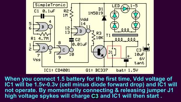 Este LED flasher parpadeará continuamente durante 10 años en un solo 1, 5V pila alcalina AA. Esto es posible por alcanzar un consumo de corriente promedio de 35uA (microamperes).Paso 1: Este es el diagrama del circuito completo de la luz intermitente