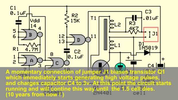 Cuando se conecta la celda de 1, 5V por primera vez, IC1 no funcionará ya que necesita un mínimo 3V para funcionar. En este momento la Vdd es 1.5v menos 0.3v (caída de tensión de D1). Por momentáneamente puente de conexión J1, transistor Q1 estará sesgado a través de R3 y comenzará a oscilar. Picos de alto voltaje (voltaje del flyback) en el colector de Q1 iluminarán el LED 1 y cargarán el condensador C4 a través del diodo D1. Voltaje en C4 (> 3v) alimentarán IC1 que empezar a correr y a correr hasta que la batería está agotadas (10 años a partir de ahora!)