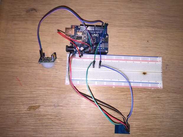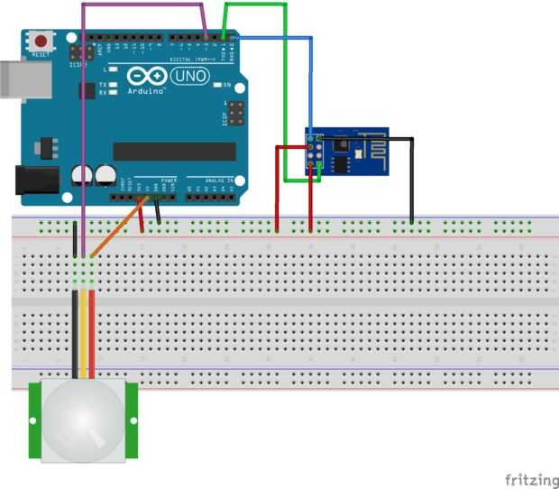 Nota cómo el PIR es alimentado con 5v, mientras que el EPS8266 sólo 3,3 v! No conecte el EPS8266 a 5v, ya fríe la Junta.