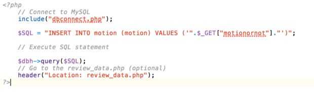 En mi ejemplo, utilizo 3 páginas: dbconnect.php, add_data.php y review_data.php ya tengo una base de datos llamada 'movimiento', que contiene una tabla de 'movimiento' (así) que tiene el 'id', 'evento' y 'movimiento', de columnas donde id y evento (timestamp) se crean automáticamente con cada inserción del movimiento.