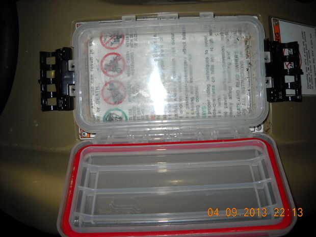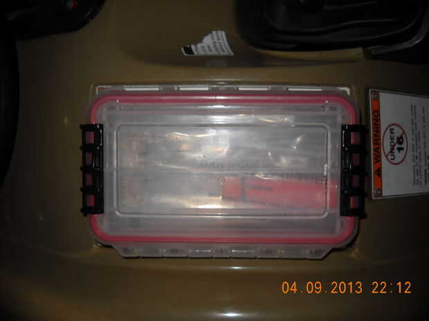 Tengo la idea de una caja seca montada mirando equipos de pesca en el walmart local. El caso que estoy usando es una caja impermeable Plano, mide aproximadamente 4" por 5", hermético y a prueba de aplastamiento. Creo que dio unos 6 dólares para él.