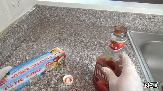 Otra forma de obtener el mismo resultado es abrir una botella de salsa de tomate, poner un trozo de plástico en la parte superior y cerrar hacia arriba. Ojala la persona tratando de salsa de tomate es lo suficientemente inteligente como para averiguar cuál es incorrecto.