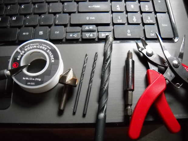 Motor de taladro 7/32 broca de 7/64" broca 1/2" broca Contador de lavabo poco Pedacitos de destornillador La soldadura de hierro Soldadura Rosen Core Alicates de punta Cortadores de alambre Cuchillo del exacto Pistola de pegamento caliente