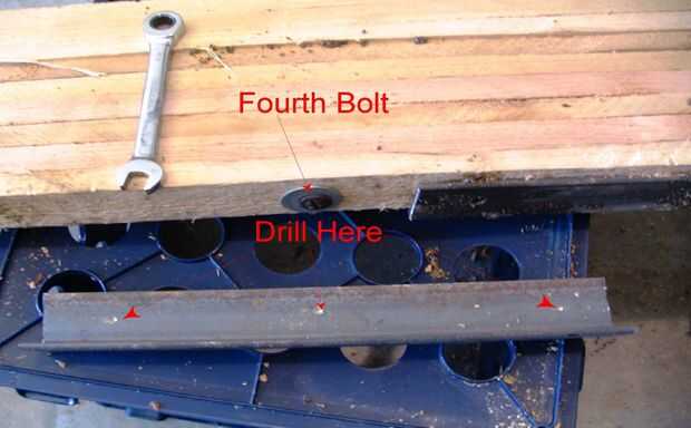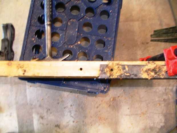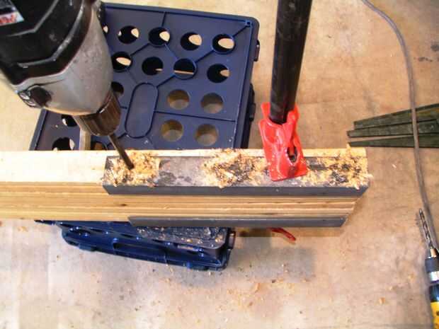 Sandwich (9) 1 x 2 de juntos. Poner 1 x 2 con el menor número de nudos para el exterior y aquellos con más nudos en medio de la pila (consulte el paso 5 para ver por qué). Poner las piezas de hierro de ángulo a cada lado y usar una abrazadera (utilicé una abrazadera) para mantenerlos todos juntos. Note que la varilla de 1" no es sin embargo en estas fotos. Yo fui colocación de cosas antes de soldar, para no tener que rehacer mi trabajo. Las barras terminaran arriba en la parte posterior de la rejilla, por lo que puede soldar con autógena primero. Haga tres agujeros en el ángulo de hierro y 1 x 2. Lo suficiente en el parte inferior del hierro de ángulo para marcar la ubicación de los agujeros de taladro. He utilizado un largo 3/8 broca de 1/4" tornillos para empujar a través de más fácil. En este punto, decidí añadir un cuarto perno sobre el ángulo de hierro por lo que pude quitar la abrazadera de tubo para perforar a través del hierro de ángulo parte inferior.