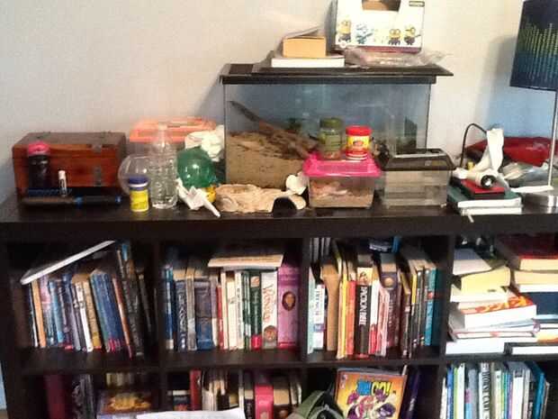 Si tienes ese tipo de librería que tiene plazas en lugar de estantes, girarlo hacia un lado! Luego de tener el espacio para poner tus libros, y puede utilizar la parte superior para guardar sus artículos personales (maquillaje cepillo para el pelo, Chapstick, etc..)!