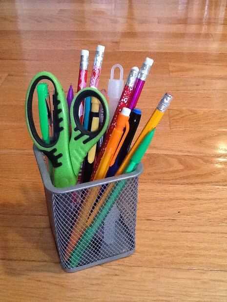 Usar vasos o recipientes para guardar sus lápices y bolígrafos. Con estas me han ayudado un montón. También puede utilizar esto en su escritorio en el trabajo o la escuela.