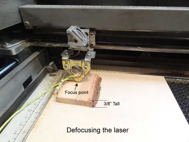 En mi último Consejo cubrí cómo utilizar el vector para solo marcar líneas en el material para producir obras de arte de línea o diseños. Pero la desventaja de este truco es que la línea es muy delgada. Pero hay una manera de marcar el láser y obtener líneas más gruesas. El láser tiene un enfoque muy apretado así que si baja su material un poco el laser va perder el enfoque y extendió. La manera de hacerlo es poner un trozo pequeño de madera de 3/8" de espesor en la parte superior del material usar y el foco del laser sobre la madera. Luego ejecuto el láser en un ajuste de vectores (con una posición más baja de potencia y una velocidad más alta). El resultado es una línea mucho más gruesa que si el láser se enfocó correctamente.