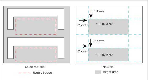 En primer lugar medir el área de destino y obtener sus dimensiones ásperos. Asegúrese de que hay suficiente espacio para lo que quieras recortar. Luego coloque el material de escarpe en el láser y la medida abajo y frente al origen del láser a la zona de destino. Por ejemplo un 1" por 2" rectángulo había situado 2.5" abajo de la tapa y 1.75" sobre desde el borde izquierdo. A continuación en archivo utilizar a guías para delimitar la zona de destino y en la distancia desde el origen como la zona en el material de desecho. Coloque su diseño o corte en la zona de destino. Asegúrese de que sus guías no imprimir y ejecutar el archivo. Si todo lo has medido correctamente el corte debe ser en el área de la blanco.
