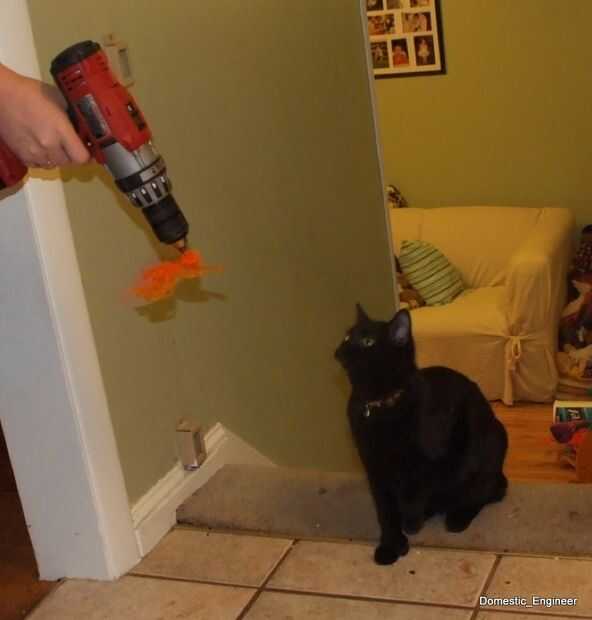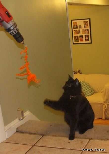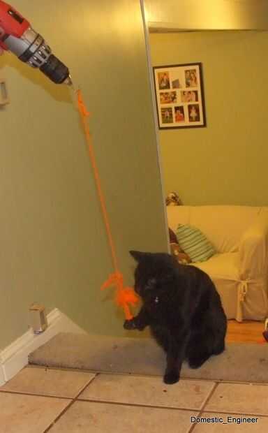Esto era especie de una obvia, después intenté hacer soga, y los gatos mantienen atacándome. Solo atar algunos cuerda/cuerda/hilo a un gancho en el taladro. Los gatos van locos para él!