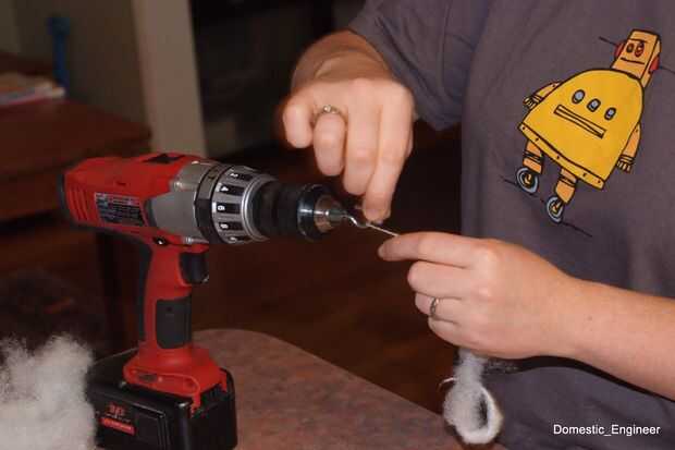 Coloque el gancho en el portabrocas. Tomar el relleno fuera el animal de peluche y gire en la mano para formar un cadena. Lazo del gancho. Ahora, tire suavemente de las fibras, mientras gira la pistola.
