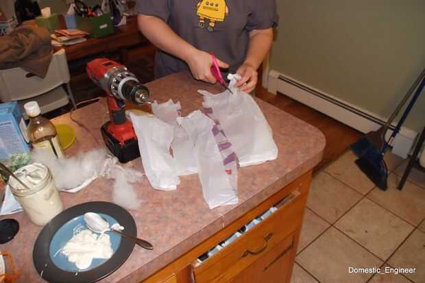 Aquí está una manera fácil de hacer cierta cuerda con algunas bolsas de supermercado. Primero cortar las bolsas en tiras. Atar un extremo con un gancho en el taladro. Luego, gire! Un nudo en el extremo cuando haya terminado.