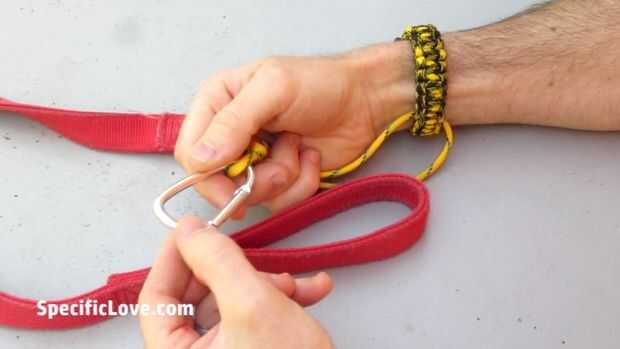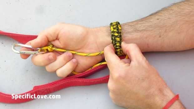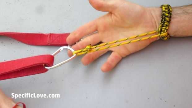 Luego até otra pequeña longitud de paracord a través de la pulsera y un carabinero.