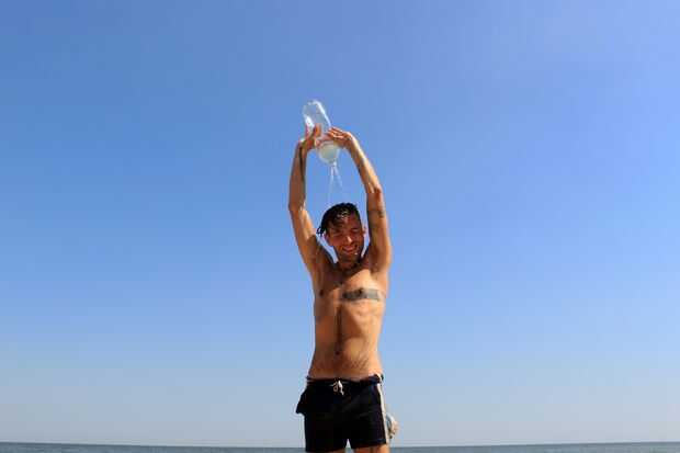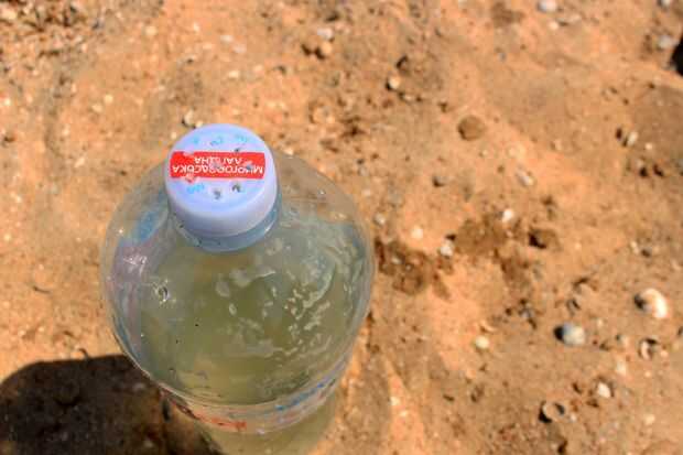 Al llegar a la playa tomar el taladro (~ 6) pequeños agujeros en la tapa de la botella de 2L, llenar la botella con agua, dejarlo a sentarse en el sol todo el día y cuando estés listo para salir tienes una fuente tibia de agua para lavar todo eso de la arena.