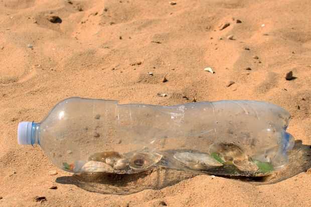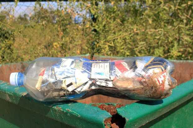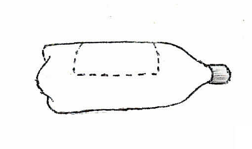 Imagina que se dibuja un rectángulo (~ 5 cm x 10 cm) en tu botella. Cortar los tres lados (dos cortos y uno largo) de ese rectángulo para que uno se quede sin cortar. Ahora tienes una puerta en su frasco que se cierra hasta después de que usted empuja algo en él. Puedes poner todos los tesoros que encontrará en la arena a través de esa puerta o, si eres como yo, usted llenará con toda la basura que encuentras al salir de la playa (por desgracia, sólo tardo unos minutos para llenar completamente la botella con envoltorios de plástico, tapas de botellas, vidrios rotos, colillas y cajas).