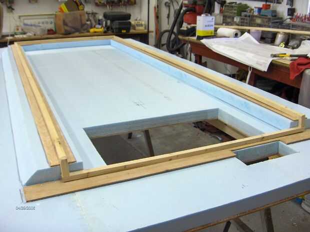 Corte la espuma de 2" para hacer un rectángulo 5' X 10'. Esta dimensión proporcionará una flotación de 600 libras. Si usted necesita para soportar más peso de duplicar en la espuma. No peso mucho más. La parte superior con el 1/8 madera contrachapada de la piel. Cortar y pegar las tiras de la madera contrachapada a la espuma y luego pegue las tiras de 1 x 2 a la madera contrachapada. Con una sierra caladora cortar los dos orificios para la elevación y aire de la falda. Pegar 6" gran pedazo de madera contrachapada en el casco donde se instalará el puesto de soporte de motor.