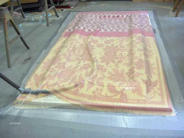De este modo, la manta no se adhieren a la fibra de vidrio. Cubrir la manta con un pedazo grande de plástico y cinta hacia abajo hasta el suelo alrededor de los bordes hacer una pequeña ranura en el plástico y conecte la manguera de vacío de su tienda vacac encenderlo y ver el vacío tire de él hasta el suelo. Si no tire un vacío Revise si hay fugas en la cinta. Corrí el vacío durante unas dos horas e hizo un gran trabajo. Cuando desarma el plástico se tire de fácilmente, no se adhieren a la fibra de vidrio